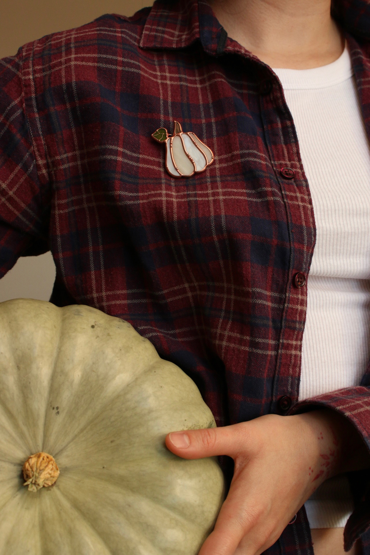 Стильна авторська брошка у формі гарбуза, виконана у вітражній техніці Тіффані. Вона створює атмосферу затишку та додає в образ теплу осінню ноту. Завдяки прозорим відтінкам скла й витонченій мідній окантовці, брошка гарно грає на світлі та виглядає по-особливому в кожному образі.