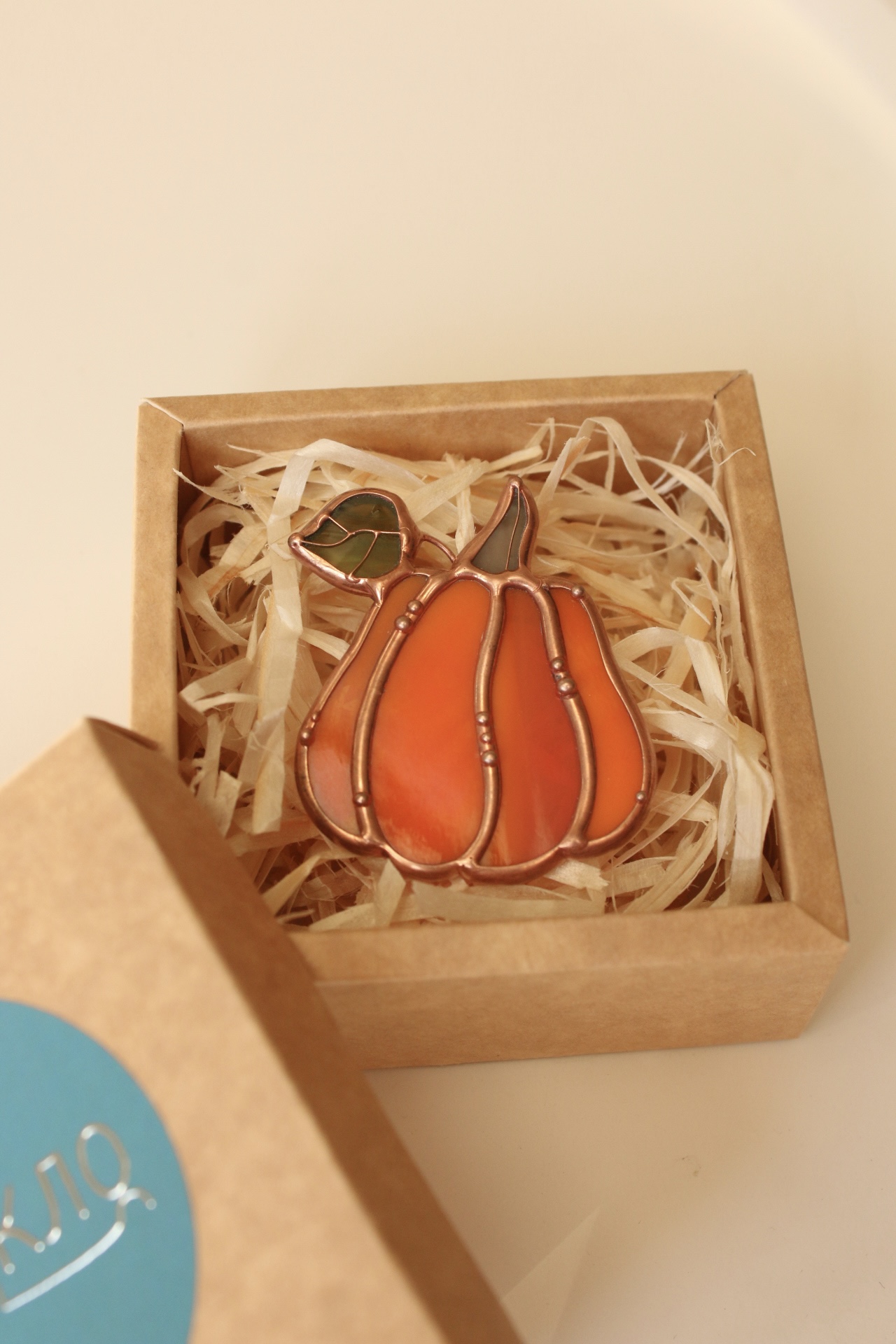 Стильна авторська брошка у формі гарбуза, виконана в техніці вітражу. Вона створює атмосферу затишку та додає в образ теплу осінню ноту. Завдяки прозорим відтінкам скла й витонченій мідній окантовці, брошка гарно грає на світлі та виглядає по-особливому в кожному образі.