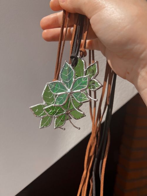 Кулон у формі листочка каштану — символ Києва, вічної весни та міських прогулянок під кронами старих дерев. Виготовлений вручну з напівпрозорого зеленого вітражного скла у техніці Тіффані, він відкидає ніжну кольорову тінь, ніби зберігає світло сонячного дня.
