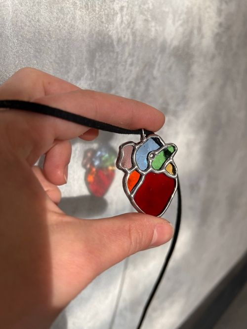 Унікальний кулон у формі анатомічного серця, створений вручну з кольорового скла у вітражній техніці. Прикраса поєднує мистецтво скла, символіку життя та сучасну естетику, натхненну ар-нуво й роботами Луїса Комфорта Тіффані.